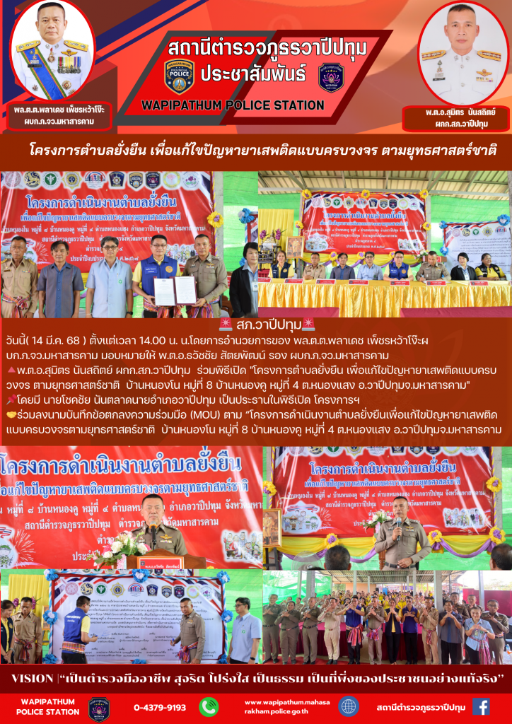 🤝ร่วมลงนามบันทึกข้อตกลงความร่วมมือ (MOU) ตาม “โครงการดำเนินงานตำบลยั่งยืนเพื่อแก้ไขปัญหายาเสพติดแบบครบวงจรตามยุทธศาสตร์ชาติ บ้านหนองโน หมู่ที่ 8 บ้านหนองคู หมู่ที่ 4 ต.หนองแสง อ.วาปีปทุมจ.มหาสารคาม